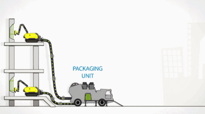 通過內(nèi)部的高壓水槍,對吸進去的混合物進行分離。這款水泥回收機器人還能將被分離后的砂石和水泥直接打包回收,轉變?yōu)樾碌慕ㄖ昧?。無需任何加工就可以實現(xiàn)建筑物材料的再利用。