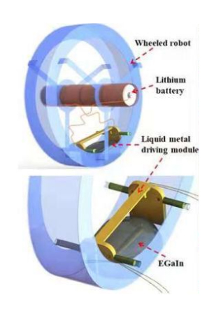 近期,中澳聯(lián)合研究團(tuán)隊(duì)設(shè)計(jì)了一種具有超疏水表面的極輕半封閉輪式結(jié)構(gòu),將液態(tài)金屬液滴限制在狹長的輪體內(nèi)部。再通過巧妙設(shè)計(jì)的隨動(dòng)微型電極支架,施加外部電場(chǎng)驅(qū)動(dòng)輪體內(nèi)液態(tài)金屬運(yùn)動(dòng),進(jìn)而持續(xù)改變輪式機(jī)器人的重心,驅(qū)動(dòng)其移動(dòng)。