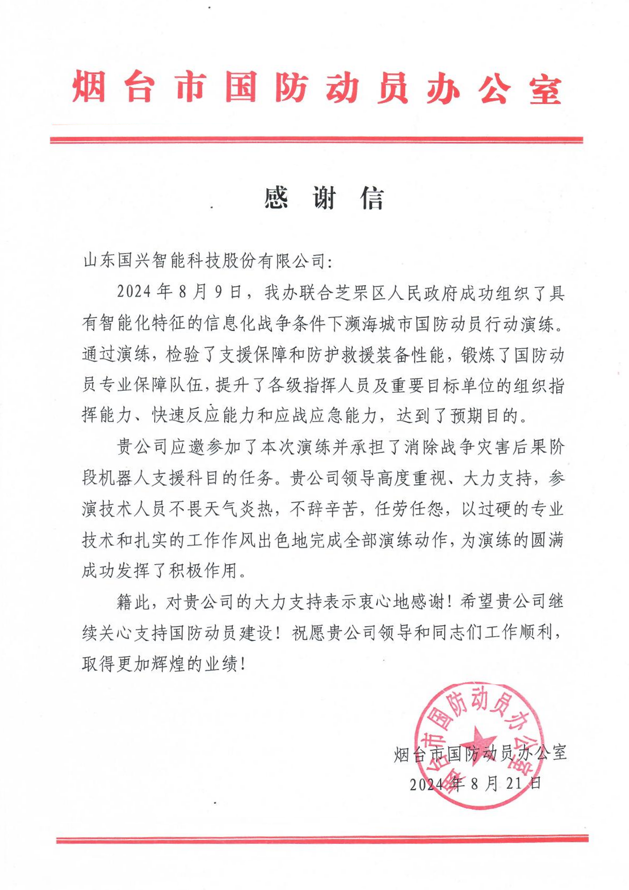 當日,國興智能出動多臺消防滅火機器人,在整體部署下高效完成消防動員任務,煙臺市國防動員辦公室對國興智能的大力支持表達誠摯感謝。