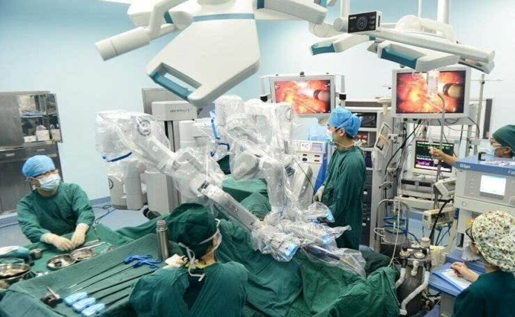 手術(shù)前工作準(zhǔn)備就緒,一臺(tái)近兩米高的設(shè)備揮舞著其“八爪魚”般的機(jī)械臂,像醫(yī)生一樣熟練地進(jìn)行手術(shù):微創(chuàng)開刀、切除腫瘤到最后縫合。而在手術(shù)臺(tái)3米開外,一名醫(yī)生正在控制臺(tái)邊,通過操縱桿控制著機(jī)械臂的每一個(gè)步驟。