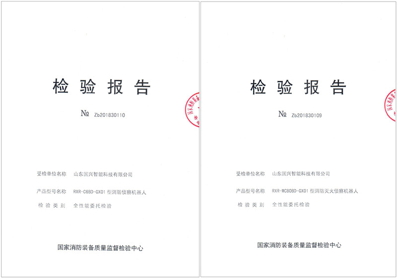 祝賀山東國興智能科技有限公司產(chǎn)品RXR-C6BD-GX01型消防偵察機器人和RXR-MC80BD-GX01型消防滅火偵察機器人獲得“國家消防裝備質(zhì)量監(jiān)督檢驗中心”頒發(fā)的檢驗報告證書。