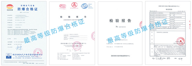 該系列整機產品獲得了國家防爆認證中心的防爆合格證書。是國內唯一的,最具權威、最高等級的防爆合格證書。其中的電機、云臺、氣體檢測、智能消防水炮等所有配件均通過國家防爆認證,成為國內真正通過防爆認證的特種機器人,自主研發(fā)的防爆電池管理系統(tǒng)及軟件,大功率驅動器、電機等產品使防爆級別遙遙領先國內同類產品,并全部獲得國家發(fā)明專利。國興智能始終把安全和生命放在產品的首位, 以人為本,臻于至善的精神貫穿防爆產品始終!