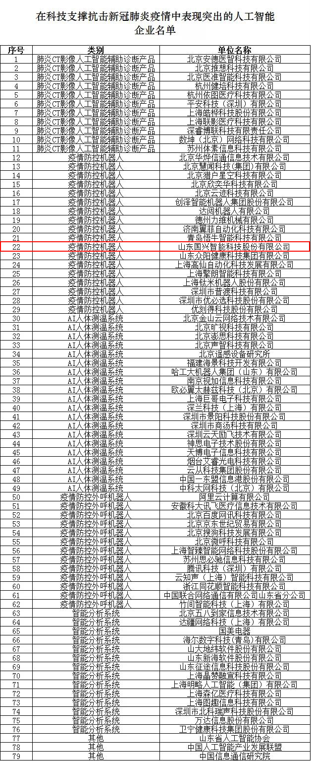 日前,工信部公布了在科技支撐抗擊新冠肺炎疫情中表現(xiàn)突出的人工智能企業(yè)名單,包括阿里云、京東等79家企業(yè)上榜。其中山東有山東國興智能科技股份有限公司、煙臺(tái)艾睿光電科技有限公司等12家企業(yè)和單位上榜。