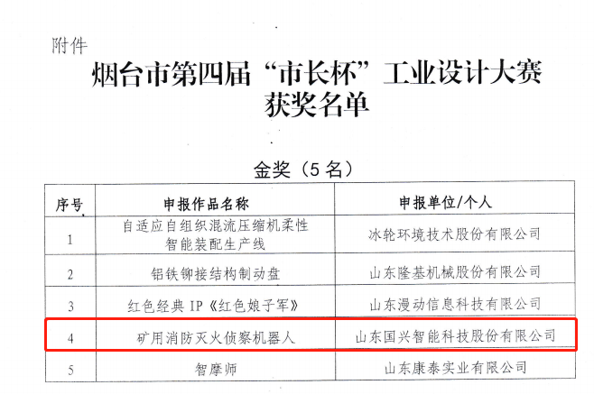 為了提高“煙臺(tái)設(shè)計(jì)”品牌影響力,推動(dòng)煙臺(tái)市工業(yè)設(shè)計(jì)創(chuàng)新發(fā)展,促進(jìn)工業(yè)設(shè)計(jì)與其他產(chǎn)業(yè)融合發(fā)展,助力煙臺(tái)爭(zhēng)創(chuàng)世界“設(shè)計(jì)之都”,以“設(shè)計(jì)點(diǎn)亮未來(lái)”為主題的煙臺(tái)市第四屆“市長(zhǎng)杯”工業(yè)設(shè)計(jì)大賽中,經(jīng)初評(píng)、終評(píng)、社會(huì)公示等程序,山東國(guó)興智能科技股份有限公司自主研發(fā)的礦用消防滅火偵察機(jī)器人憑借產(chǎn)品的科技創(chuàng)新性與技術(shù)突破性斬獲金獎(jiǎng)。