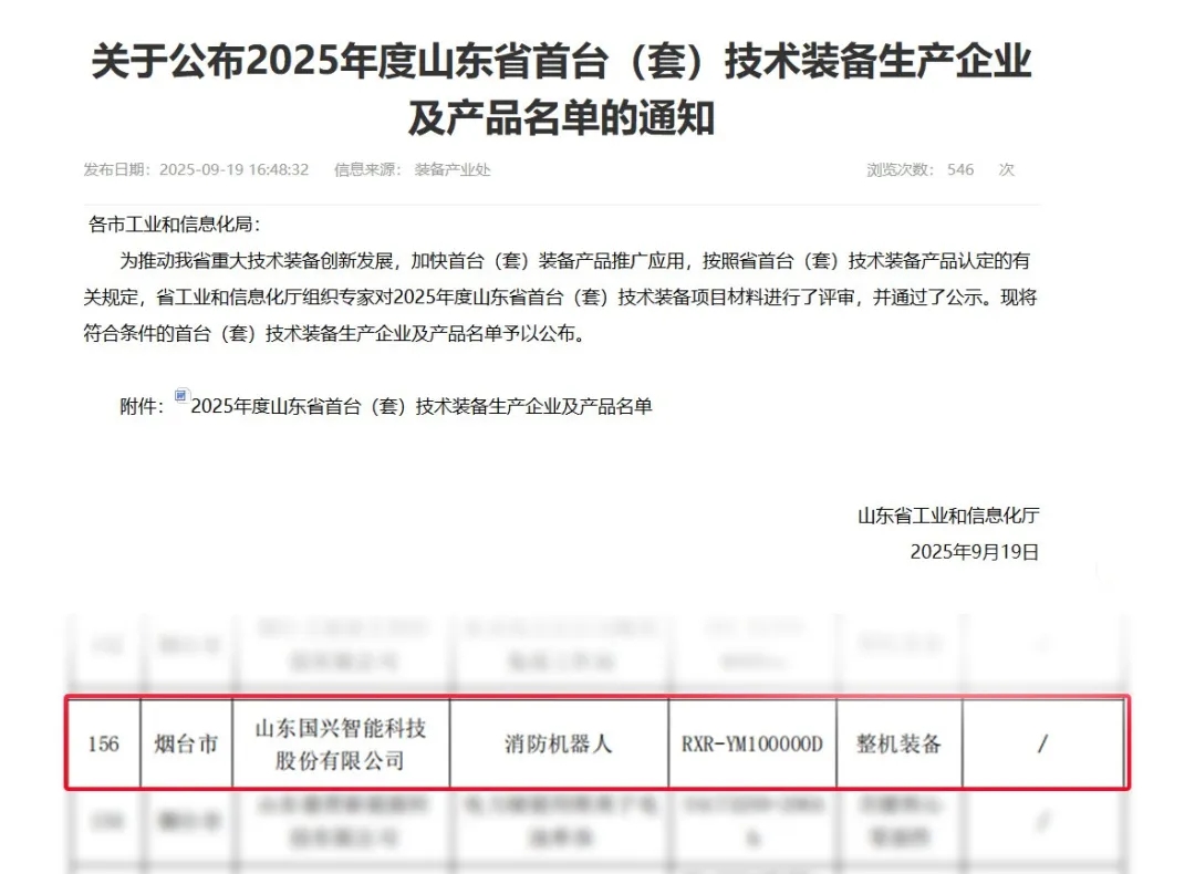 為推動山東省高端裝備產(chǎn)業(yè)高質(zhì)量發(fā)展,加快培育新質(zhì)生產(chǎn)力,充分發(fā)揮首臺(套)政策的支撐作用——“2025年度山東省首臺(套)技術裝備生產(chǎn)企業(yè)及產(chǎn)品名單”正式公布。山東國興智能科技股份有限公司消防機器人RXR-YM100000D成功登榜。