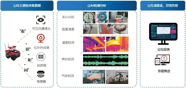 多數(shù)港口碼頭巡檢、化工/石油/天然氣站巡檢、工廠巡檢、管廊巡檢等爆炸危險(xiǎn)性工作場(chǎng)景,環(huán)境安全風(fēng)險(xiǎn)系數(shù)都很高,不僅涉及單一環(huán)節(jié),更貫穿于整個(gè)生產(chǎn)鏈條。一個(gè)局部泄漏可能引發(fā)火災(zāi)、爆炸或大面積污染,形成“事故鏈”。因此只有人工巡檢是不夠的,傳統(tǒng)的人工巡檢問(wèn)題很多,搭配機(jī)器人巡檢不但提高了工作效率,解決巡檢質(zhì)量分散、手段單一的問(wèn)題,而且機(jī)器人每次巡檢定時(shí)、定點(diǎn)、定角度的程序化作業(yè)保證了巡檢到位率和及時(shí)性,可以提高巡檢的精準(zhǔn)性和客觀性。